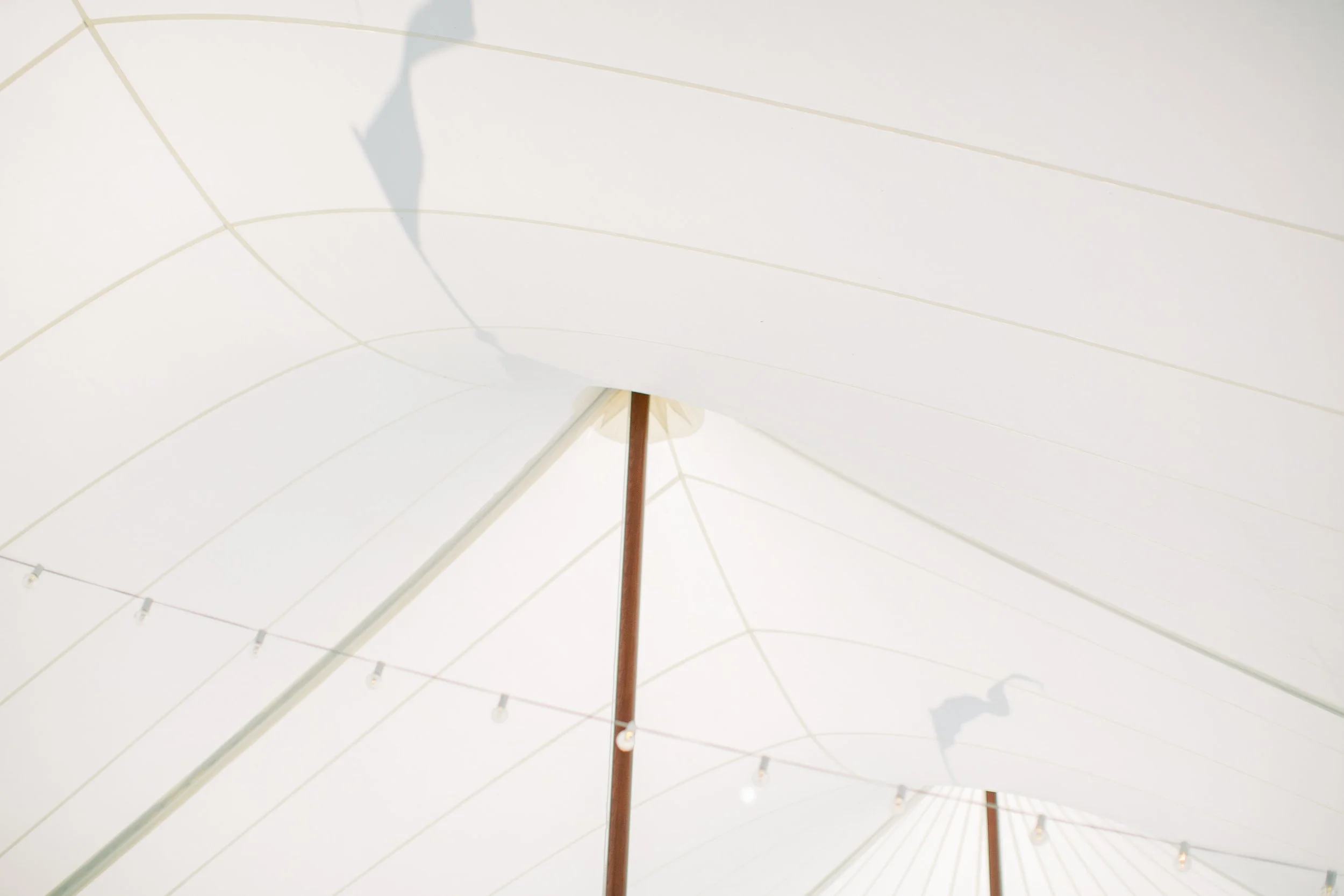 Sailcloth tents are similar to pole tents as they use tension on the side poles and center poles to support the vinyl top. Sailcloth tents have center poles down the middle of the tent which provides support to the vinyl tent top. These center poles provide convenient ways to decorate the interior with lighting, draping or other decorations.